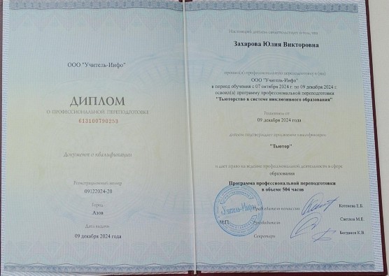 Программа профессиональной переподготовки "Тьюторство в системе инклюзивного образования" в объеме 504 часов.